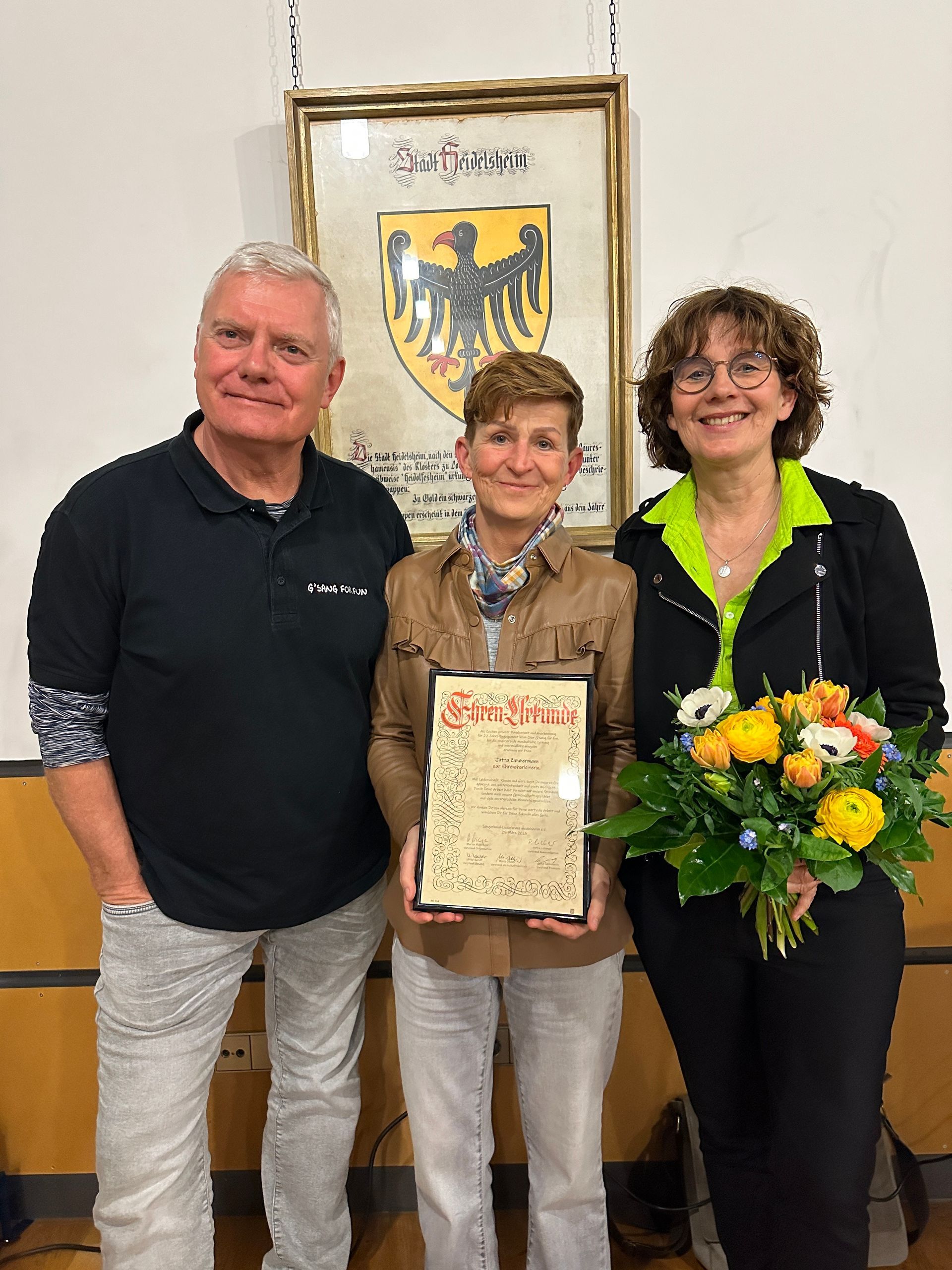 Der Höhepunkt der Ehrungen war die Ernennung von Jutta Zimmermann zur Ehrenchorleiterin. Ihr wurde aufgrund der 22 Jahre, die sie den Chor G’sang for fun mit viel Engagement, großem musikalischen Können und unermüdlicher Hingabe geleitet hat, diese große Ehre zuteil. Stehend applaudierte der Chor minutenlang und unterstrich damit seine große Dankbarkeit und Verbundenheit mit der ausscheidenden Dirigentin.